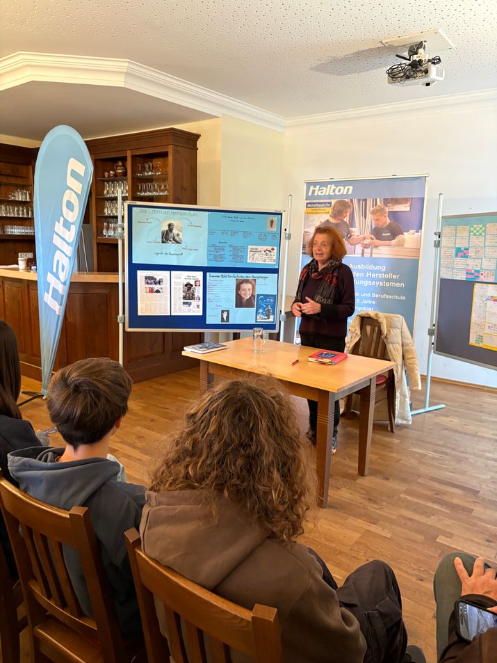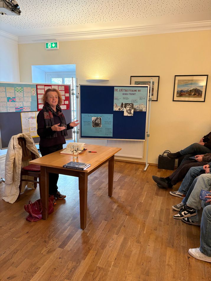 Die Schüler der 8. und 10. Klasse hatten sich bereits im Vorfeld intensiv mit Kriemhild und Herrmann Buhl beschäftigt. Dabei entstanden Plakate, Präsentationen und kreative Arbeiten, die sowohl den berühmten Alpinisten als auch die Perspektive der Autorin beleuchteten. Besonders im Mittelpunkt stand die Frage: „Was macht einen Vater aus?“ – ein Thema, das im Roman eine zentrale Rolle spielt.